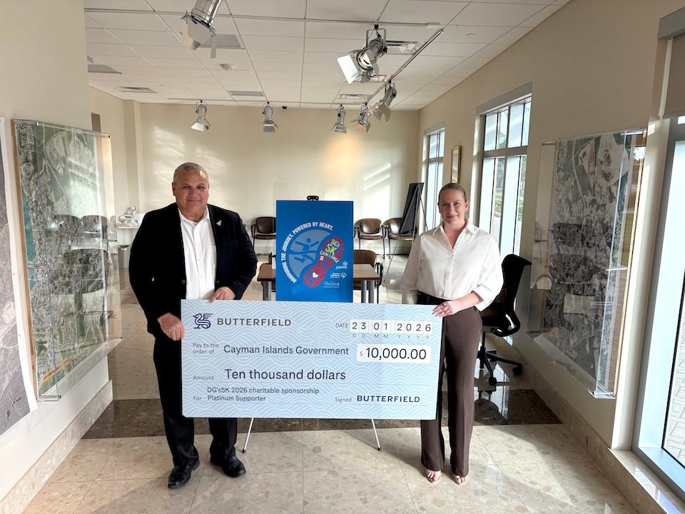Caption: Deputy Governor Manderson receiving the sponsorship cheque from a representative for Butterfield Cayman.