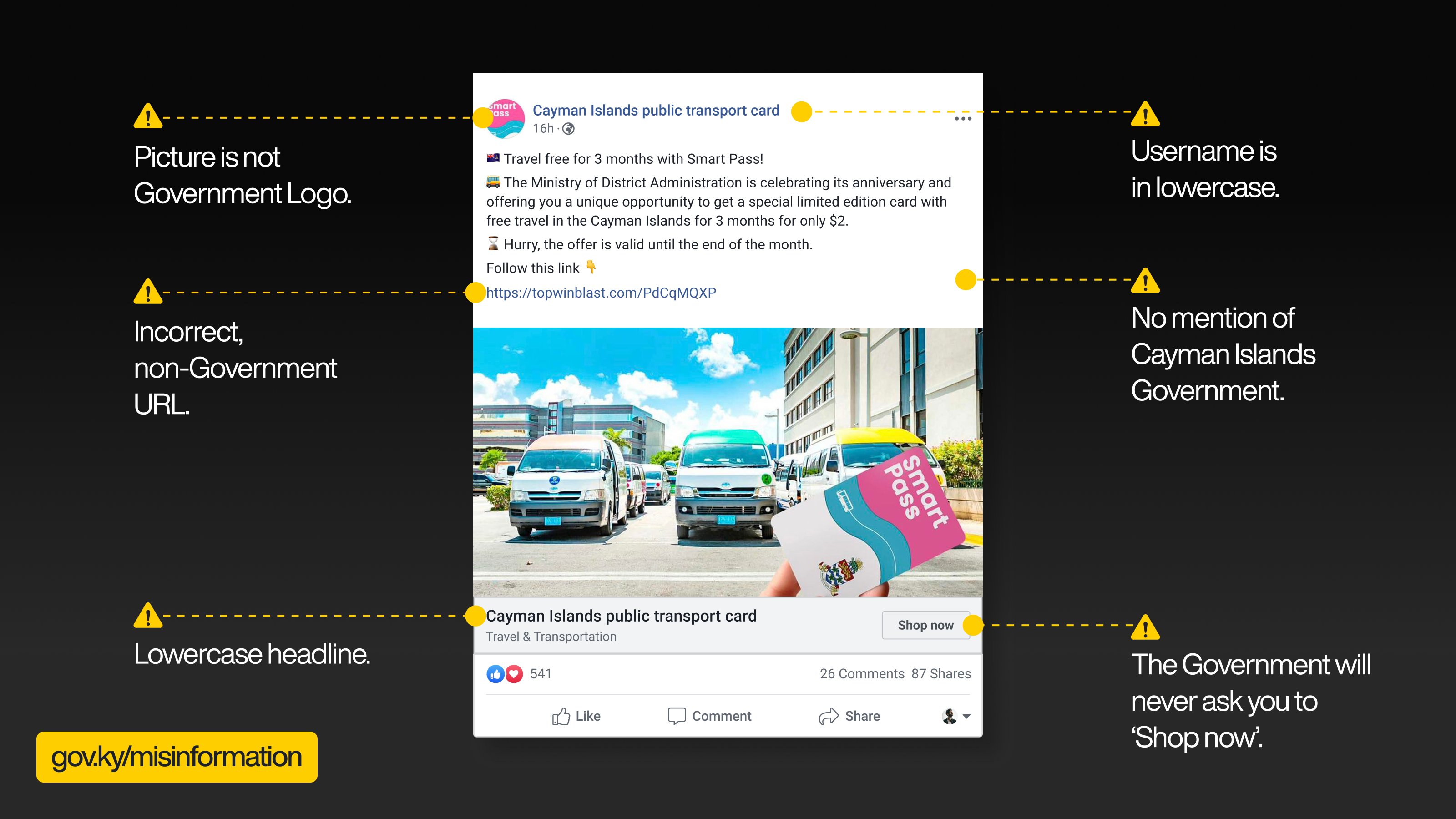 The Cayman Islands Government (CIG) is aware of a number of misleading messages, scams, and sources of false news circulating online.Read more about these on our Official Government Misinformation Alerts Page.