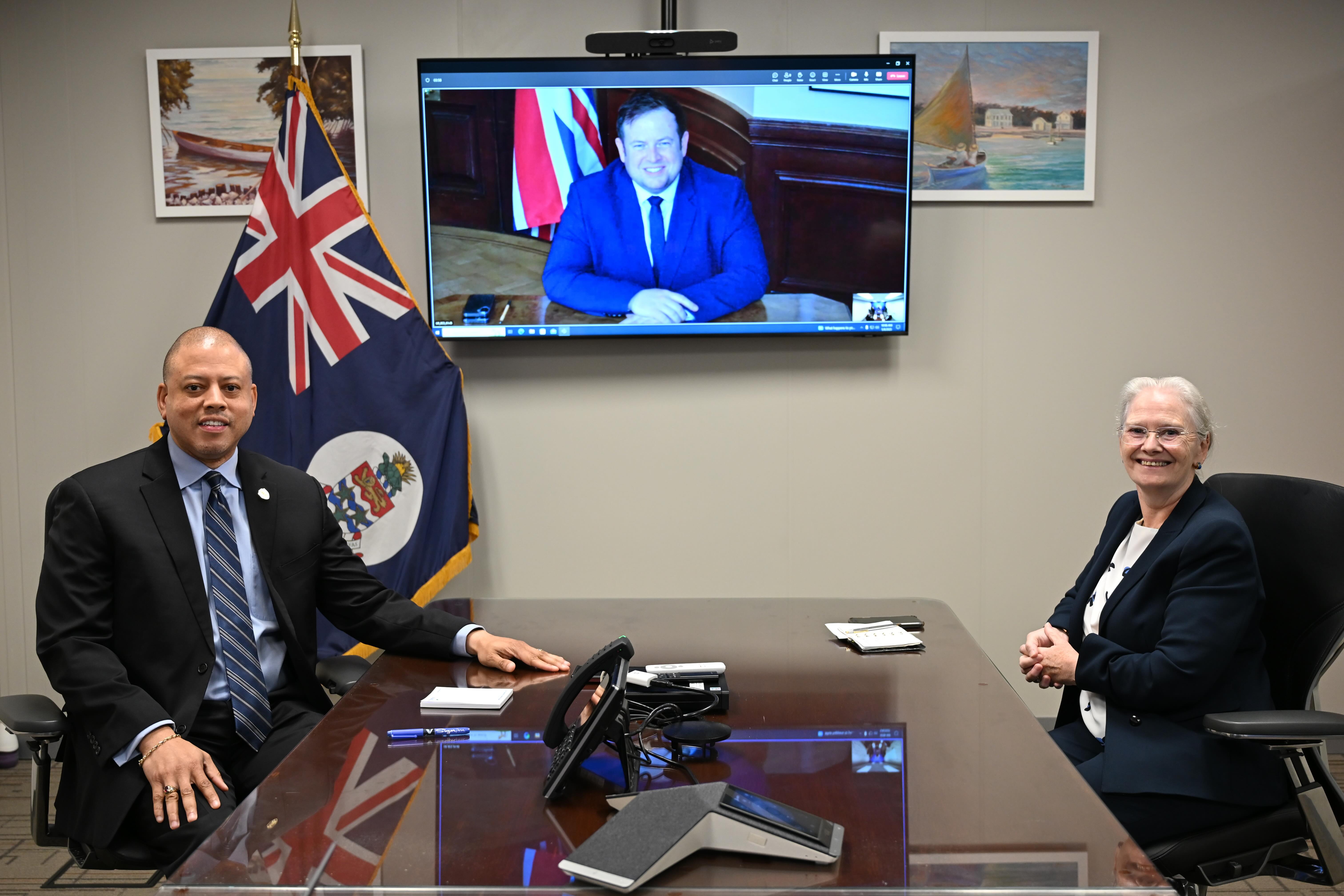 Photo caption: Premier Honourable Andre Ebanks (left) and the United Kingdom’s Minister of State for the Overseas Territories in the Foreign, Commonwealth and Development Office, Honourable Stephen Doughty virtually met for an initial discussion this morning (Thursday, 8 May.). Joining in the discussion was Her Excellency Governor Jane Owen.