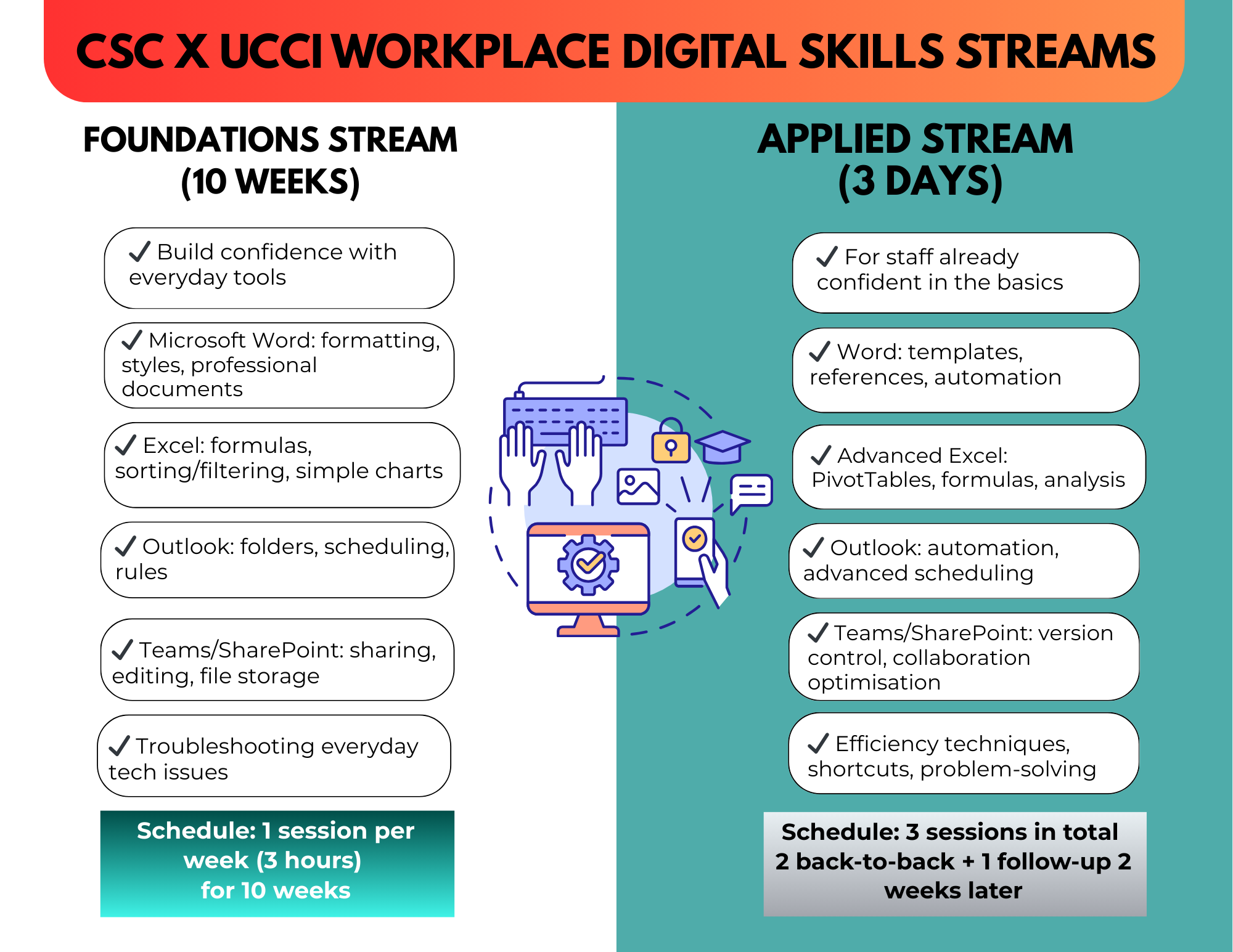 Foundations Stream – A 10-week programme for participants who want to strengthen their confidence and efficiency in core workplace tools. Focuses on essential skills that form the base for more advanced digital work.