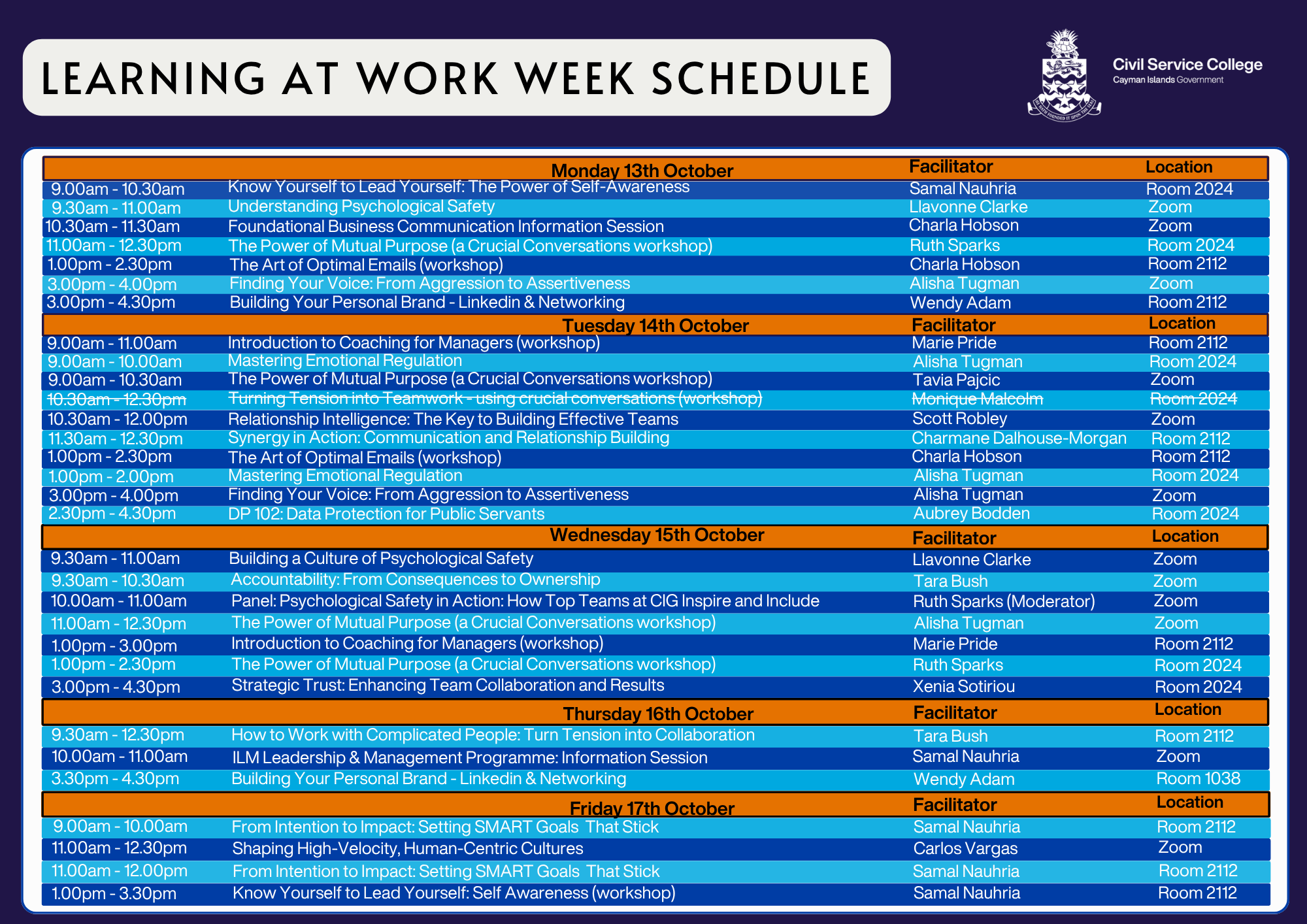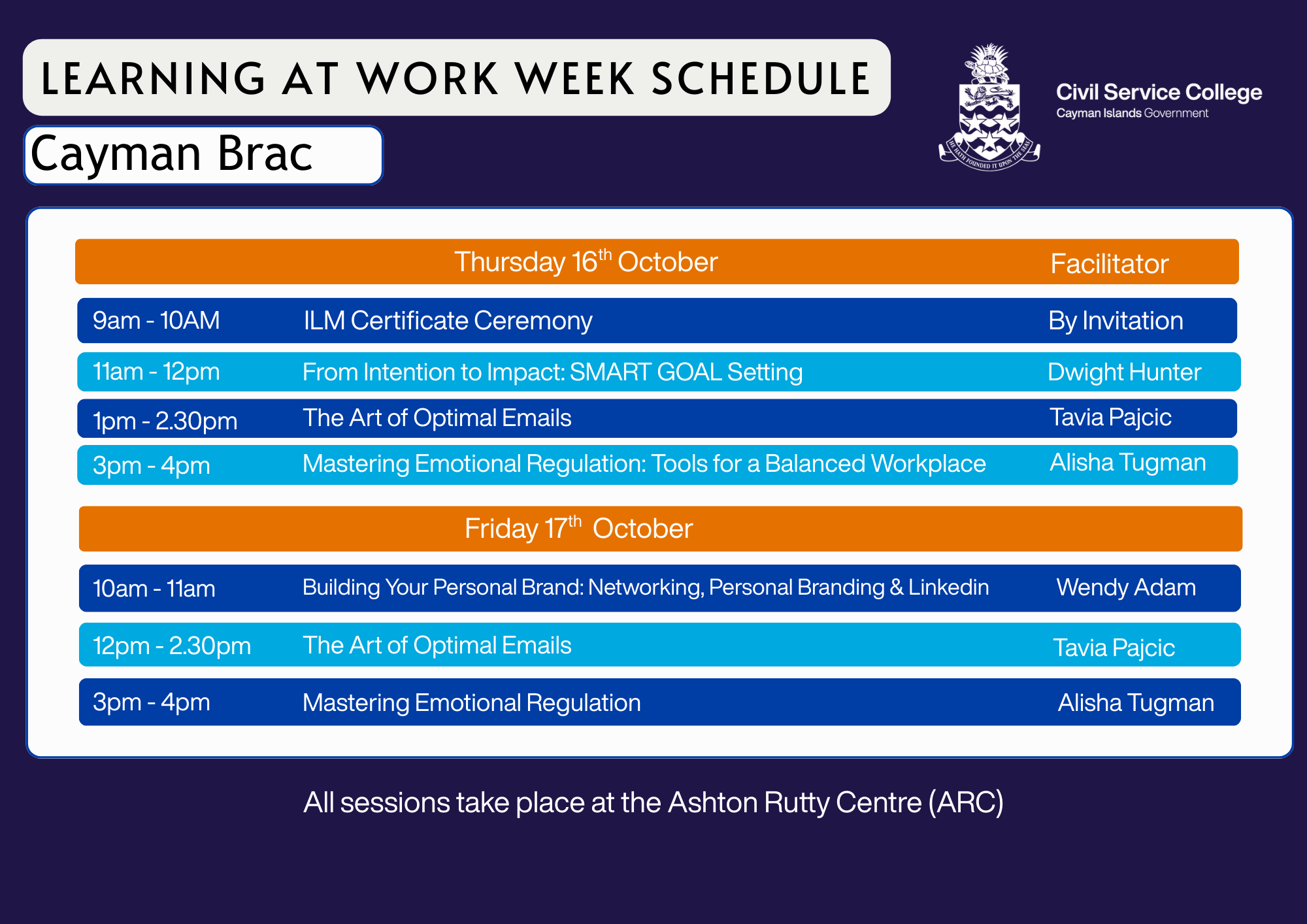 The first schedule lists all in-person sessions in Grand Cayman and all online sessions. The second schedule lists all in-person sessions in Cayman Brac. The online sessions are open to all civil servants.