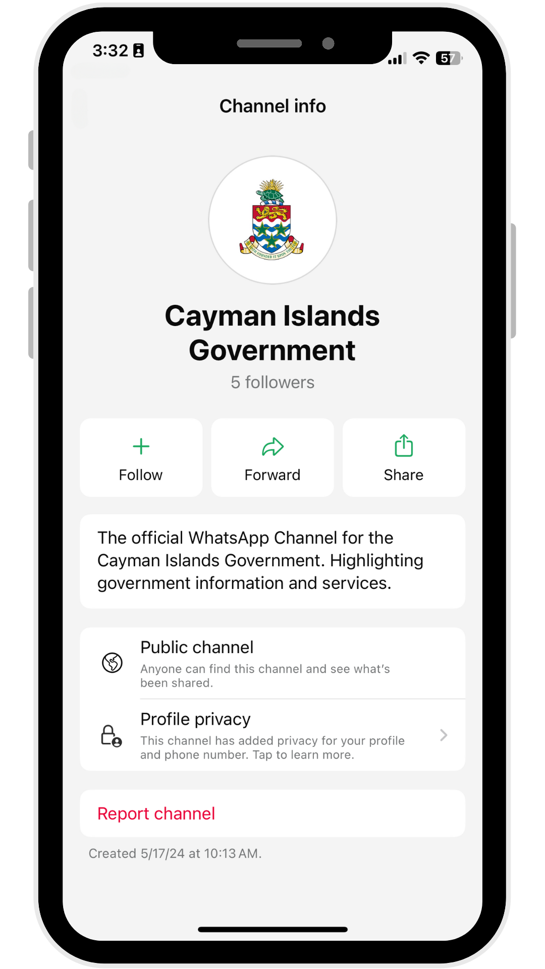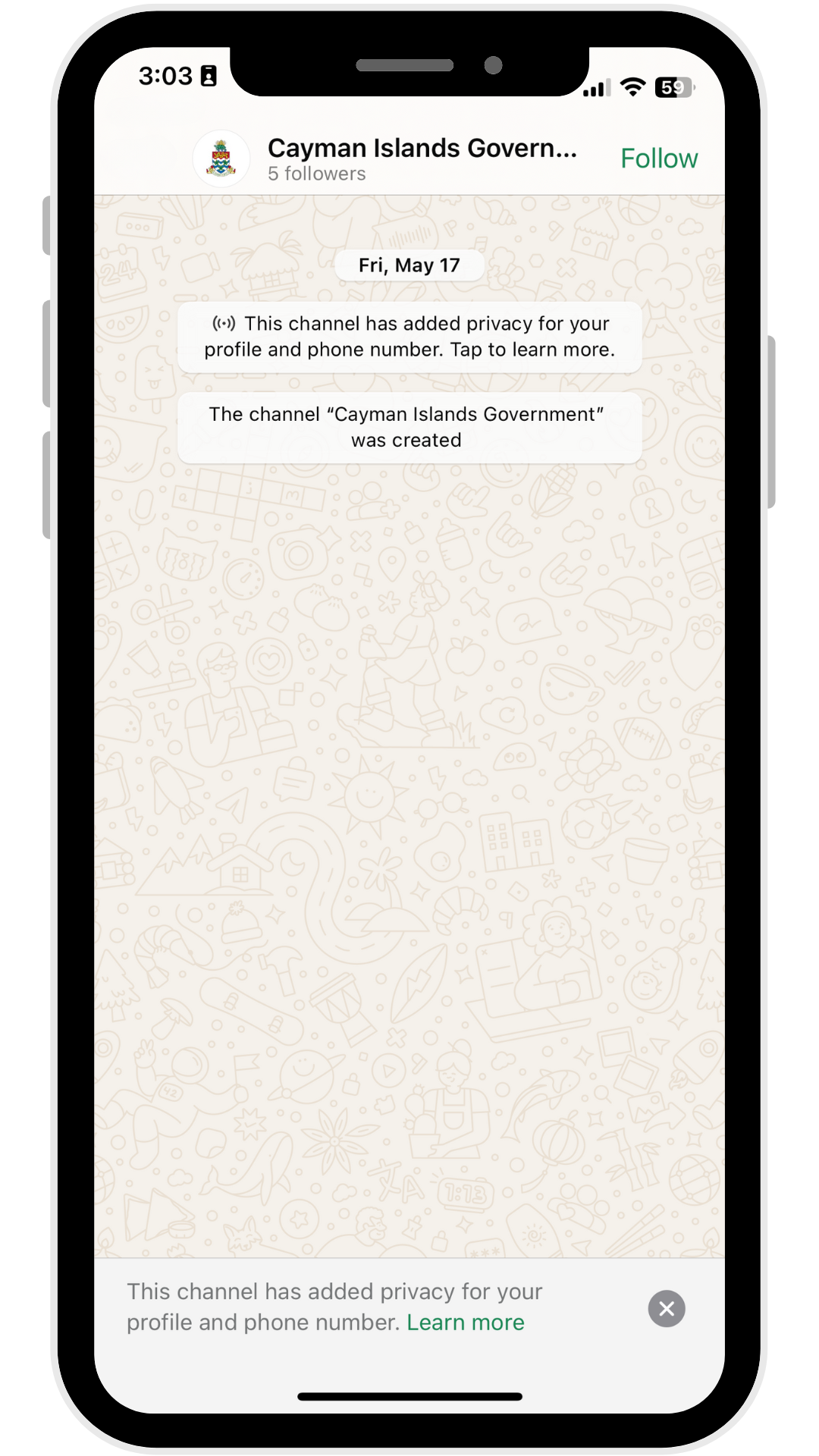 The Cayman Islands Government now has a WhatsApp Channel to provide the public with timely updates and greater access to information. Join our channel to get the latest on topics of national importance: